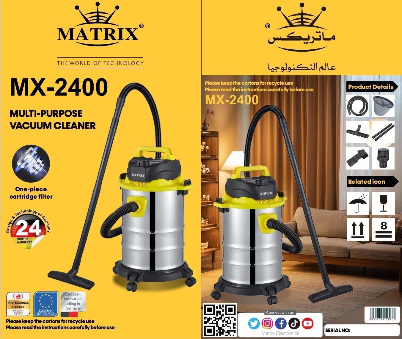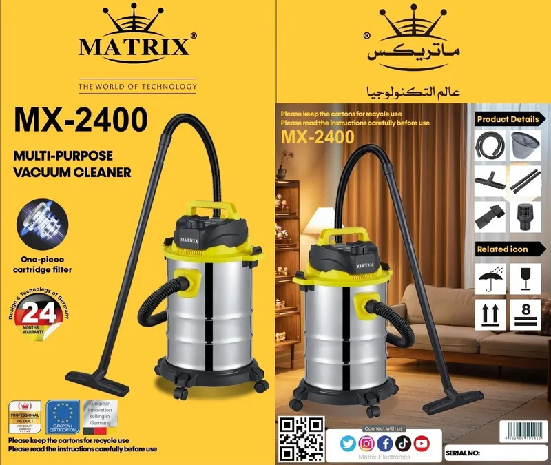 و أخيرا صفحتكم بيتنا جابتلكم المكنسة كهربائية متعددة الاستخدامات ماتريكس لي تخدم الماء و الغبرة استمتع بتجربة تنظيف استثنائية مع مكنسة ماتريكس القوية والمصممة لتلبية جميع احتياجاتك المنزلية والمهنية. بفضل تصميمها العملي وهيكلها المعدني المتين، توفر هذه المكنسة أداءً قويًا وموثوقًا في كل مرة.